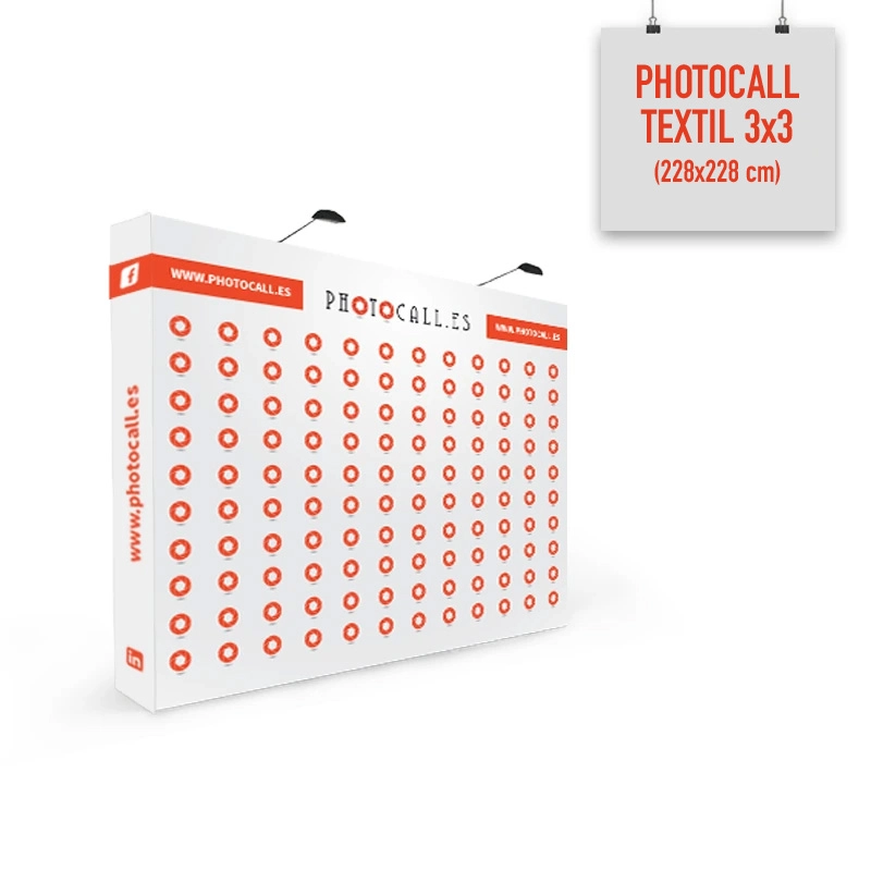 Si es la primera vez que has de comprar un fotocall deberías saber de que se trata. El photocall es un Muro promocional ideal para eventos y presentaciones. Tiene una estructura de aluminio plegable con apertura Pop Up tipo acordeón y sistema de enganche mediante velcro. La gráfica está impresa en tela téxtil 100% poliéster de 240 grs, además ofrece un acabado opacante por la parte trasera gracias al alto gramaje del material. Resulta un material ideal gracias a su textura antiarrugas.