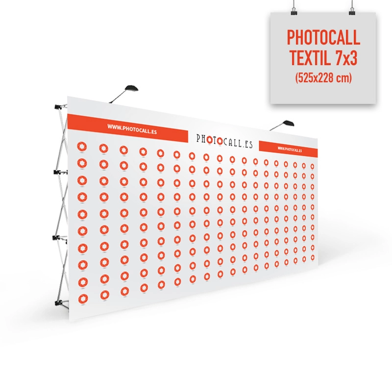 Photocall textil 7×3, Muro promocional ideal para eventos y presentaciones. Estructura de aluminio plegable con apertura Pop Up y sistema de enganche mediante velcro. Evita costes de instalación con un gran impacto visual. Gráfica impresa a todo color en téxtil opaco antiarrugas, 100% polyester.